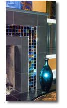 Tifini - Fused crushed glass tiles in sizes 2x2, 1x8 and 2x8 and in 8 colors. These tiles are mirrored for a dynamic sparkling effect. They complement the mirrored Crystal Visions line and are frequently used in combination. The mirror tiles are recommended for indoor use only and in dry areas since the backing is a true mirror.